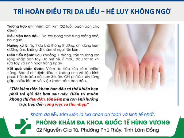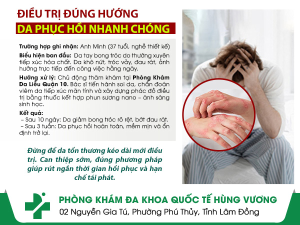 Với nhiều người làm việc thường xuyên tiếp xúc hóa chất, tình trạng khô rát, bong tróc da tay dễ bị xem nhẹ và chấp nhận “sống chung”. Thế nhưng, nếu không xử lý đúng cách ngay từ đầu, tổn thương da có thể kéo dài, ảnh hưởng trực tiếp đến công việc và sinh hoạt hằng ngày. Trường hợp dưới đây cho thấy việc thăm khám sớm đã tạo ra khác biệt rõ rệt.