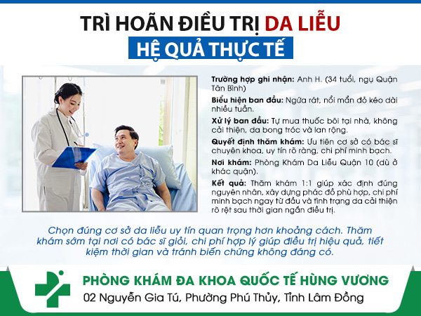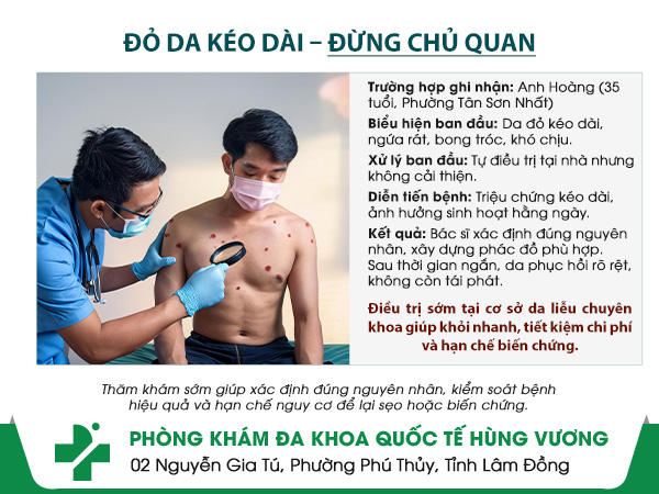 Không ít người tại Tân Bình gặp các vấn đề đỏ da, viêm da nhưng thường chủ quan tự điều trị tại nhà. Chỉ đến khi bệnh kéo dài, tái phát hoặc gây khó chịu trong sinh hoạt hằng ngày, họ mới tìm đến cơ sở chuyên khoa để thăm khám. Trường hợp dưới đây là một ví dụ điển hình.